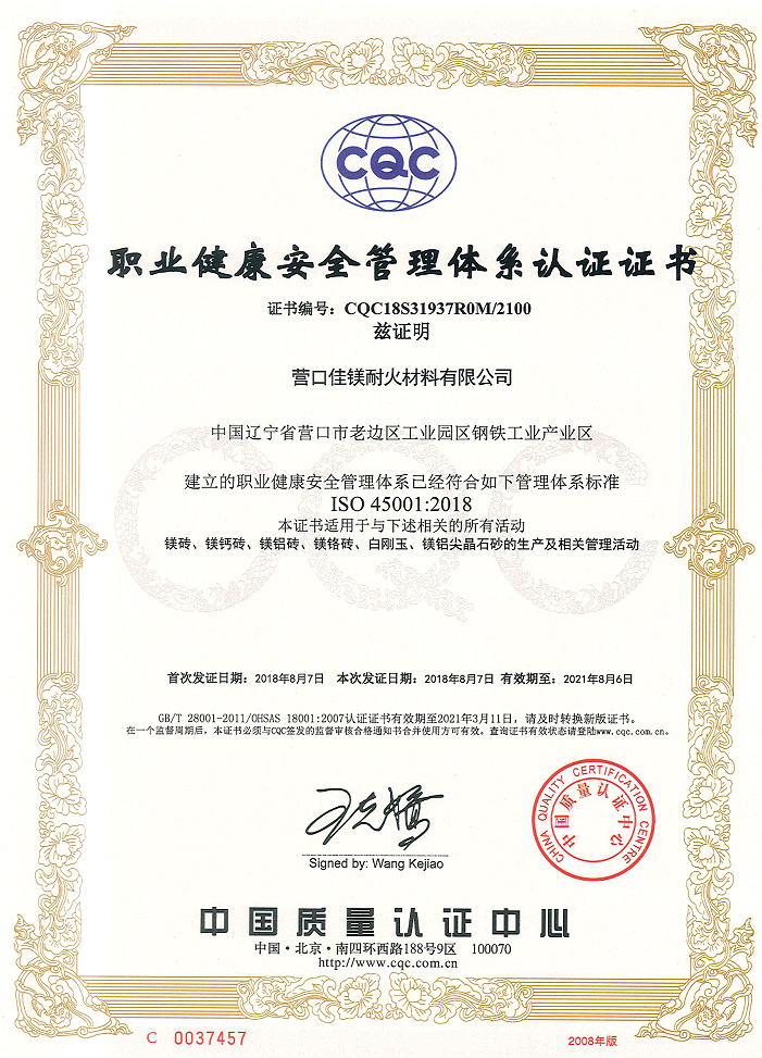 職業(yè)健康安全管理體系認證證書